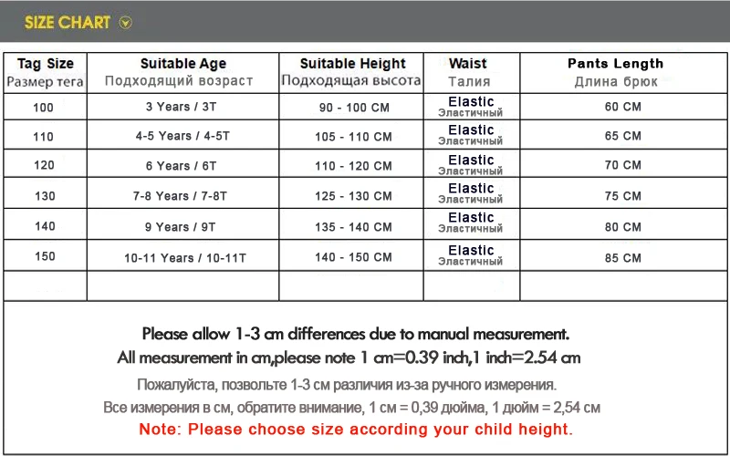 Note: Please choose size according your child height. Please allow 1-3 cm differences due to manual measurement. All measurement in cm,please note 1 cm=0.39 inch,1 inch=2.54 cm |