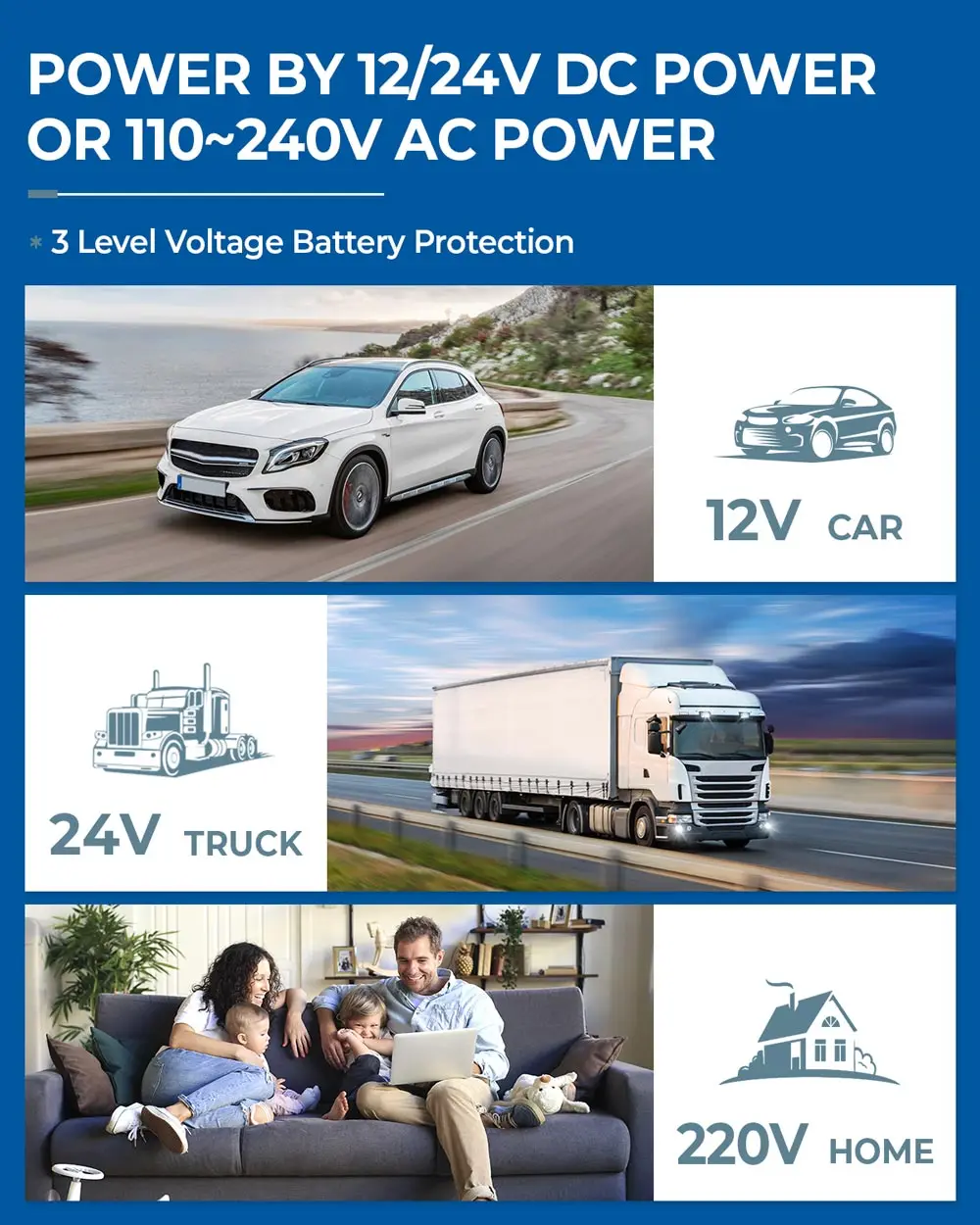 【Dual Charging Methods】 can be pluged in domestic and outdoor(AC 100V-240V,DC 12V-24V)