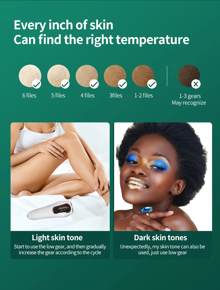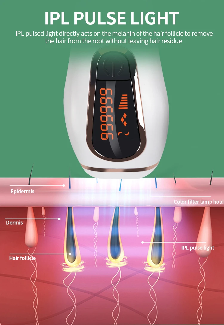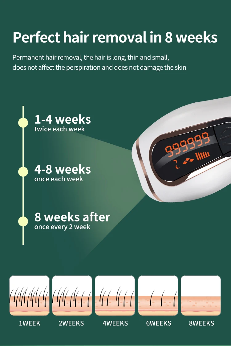 When IPL stimulates hair and hair roots under skin, the melanin inside will absorb energy of the pulsed light. This process makes hair follicle enter a dormant period. The growth speed will also slow down, even stop completely. And finally, hair will slowly fall Off within 1-2 weeks. 8 weeks later, you’ll have silky skin.