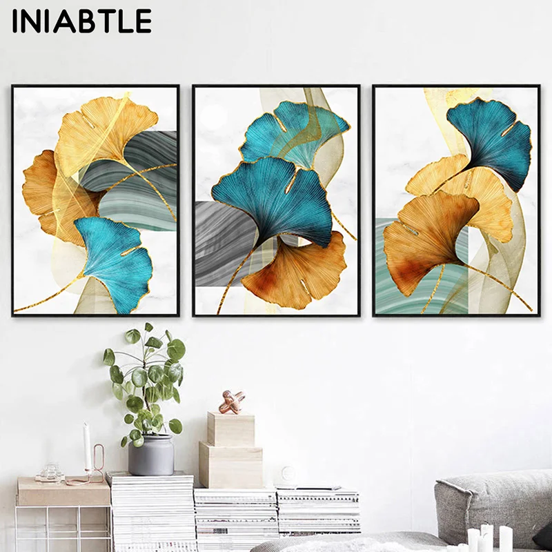 Blue Green Yellow Gold Leaf Plant Flower Canvas Poster Abstract Painting Wall Art Print Nordic Modern Pictures Living Room Decor quantity