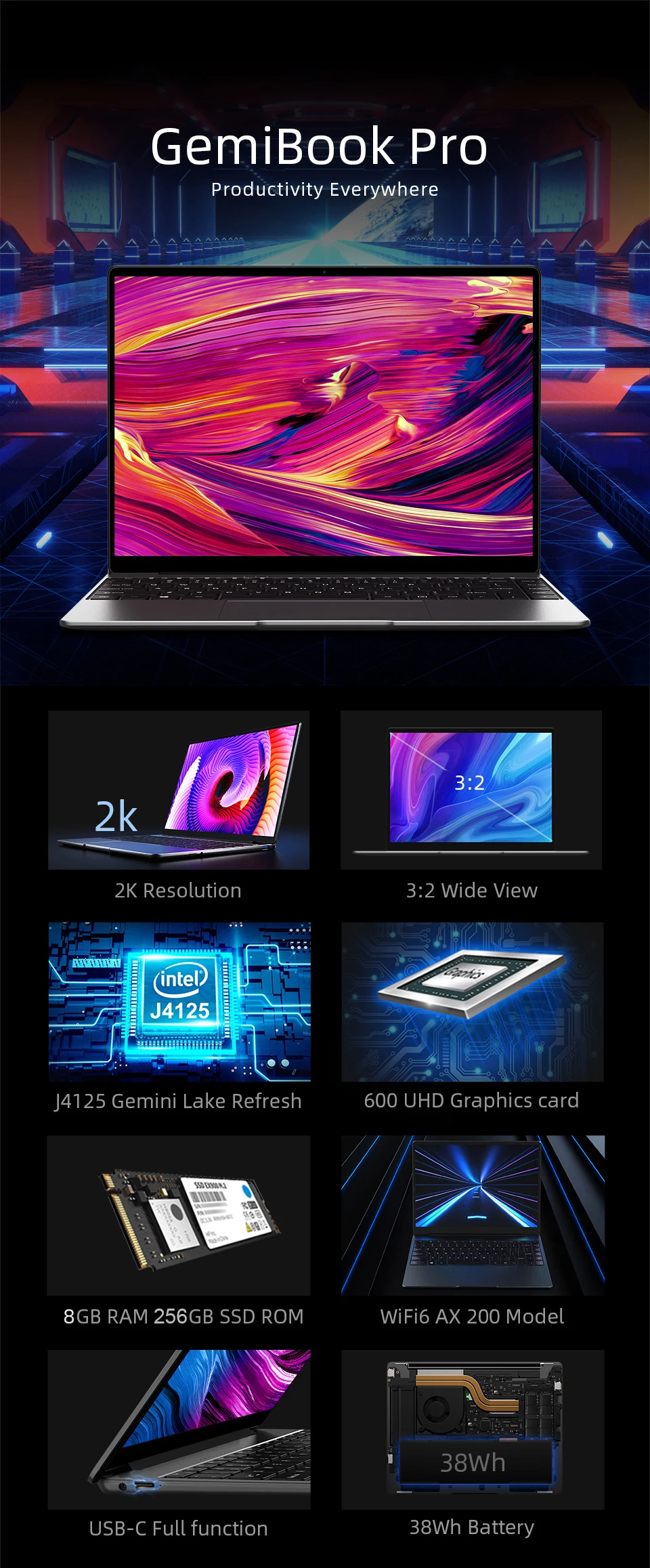 CHUWI GemiBook Pro 14inch 2K Screen 8GB RAM 256GB SSD Laptop Intel Gemini lake J4125 Quad Core Windows 10 With backlit keyboard