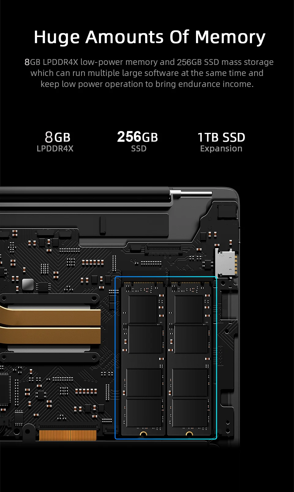 8GB LPDDR4X low-power memory and 256GB SSD mass storage which can run multiple