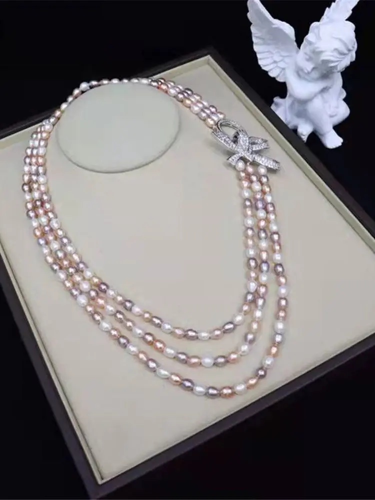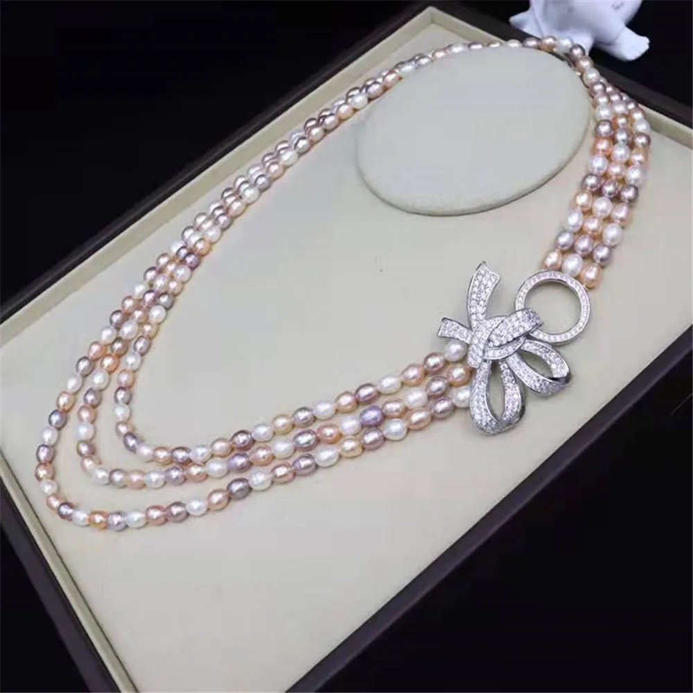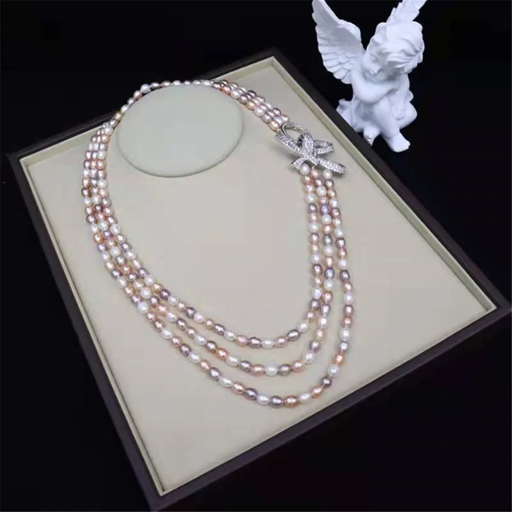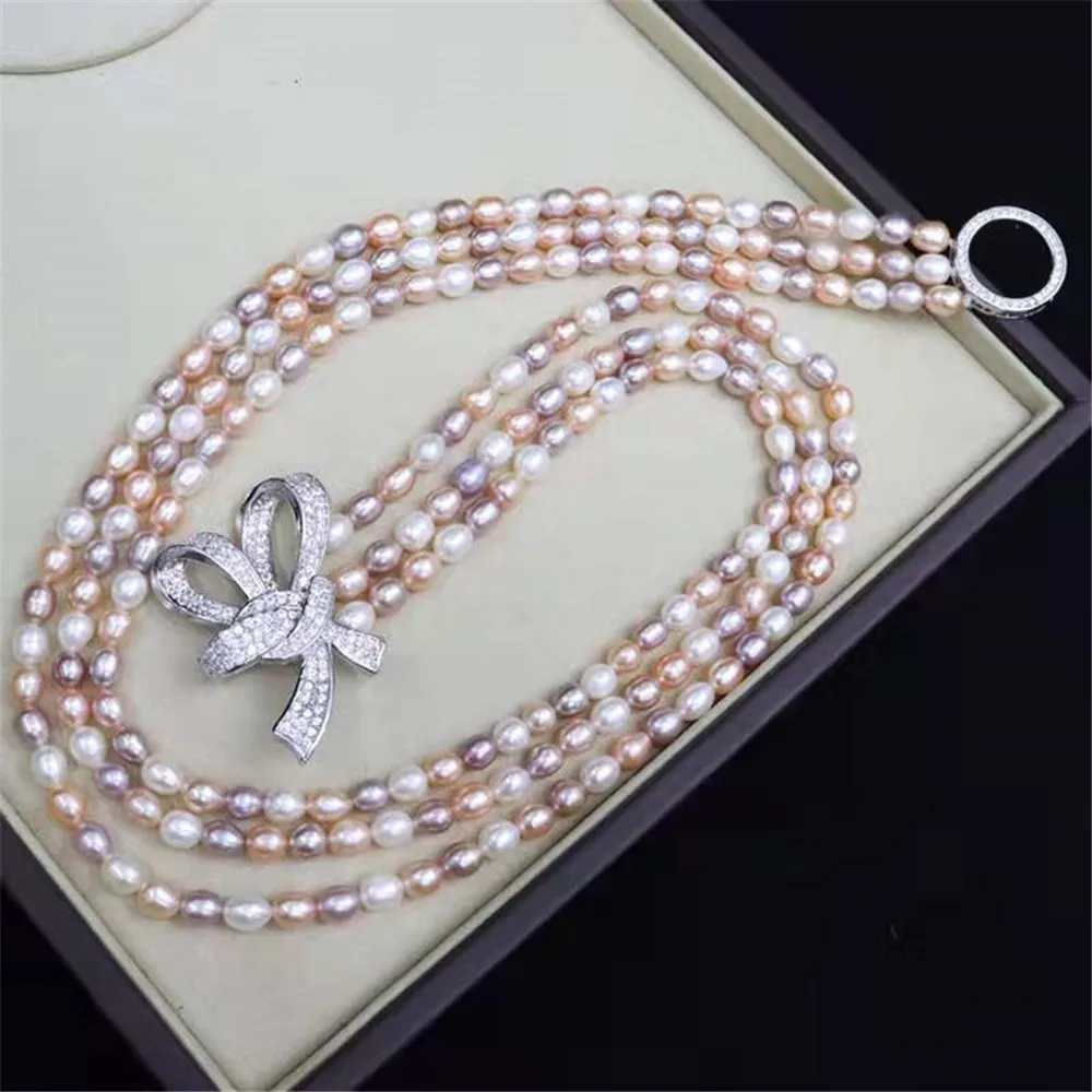 Female Natural Freshwater Pearl Necklace 5-6mm Mixed Color Rice Beads 18k Gold Full Diamond Micro Inlaid Bow Necklace quantity