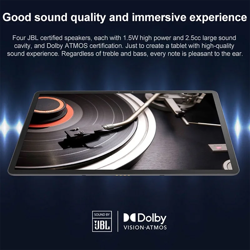 Four JBL certified speakers, each with 1.5W high power and 2.5cc large sound cavity, and Dolby ATMOS certification. Just to create a tablet with a high-quality sound experience. Regardless of treble and bass, every note is pleasant to the ear.