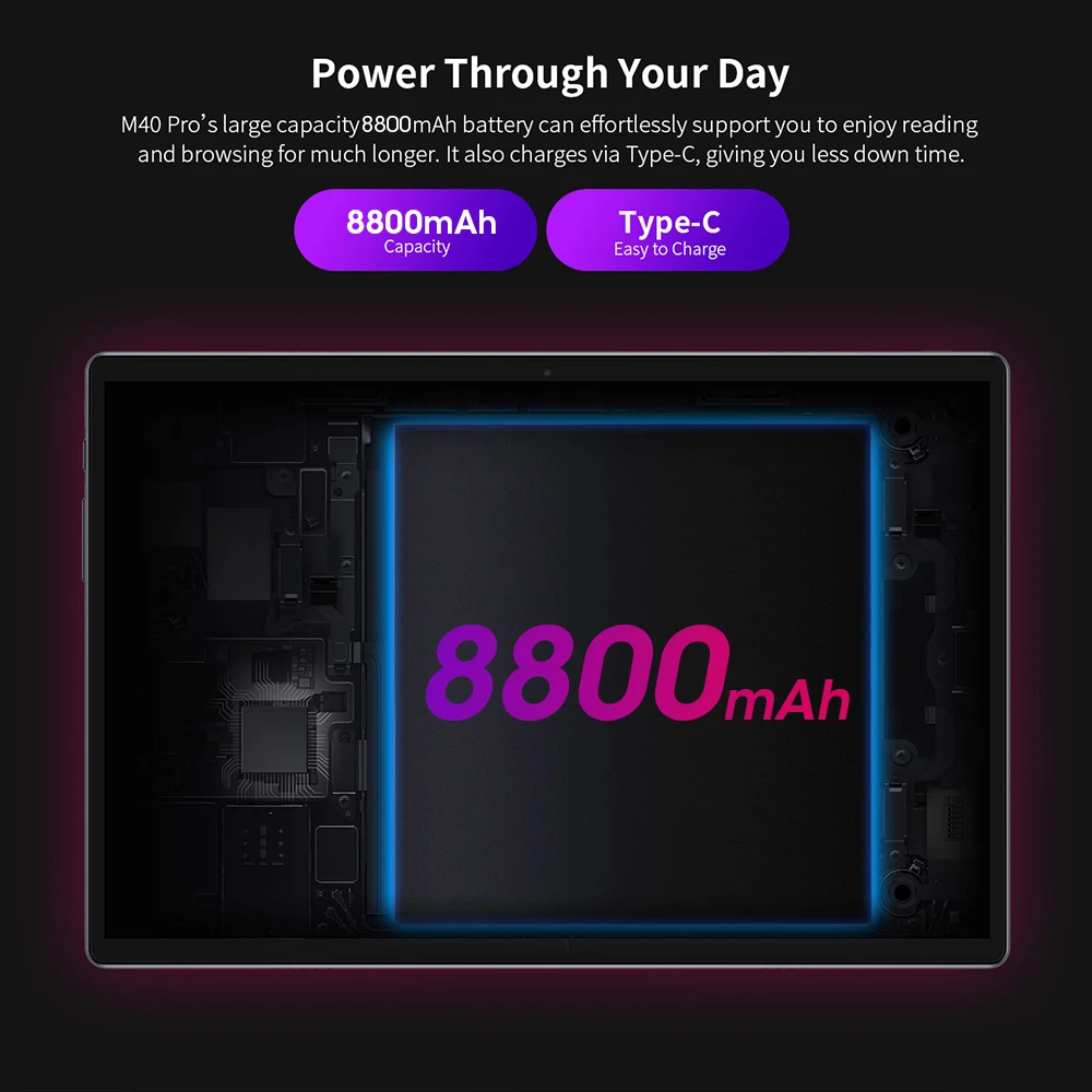M40 Pro’s large capacity 8800mAh battery can effortlessly support you to enjoy reading and browsing for much longer.lt also charges via Type-C, giving you less down time.