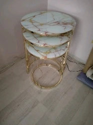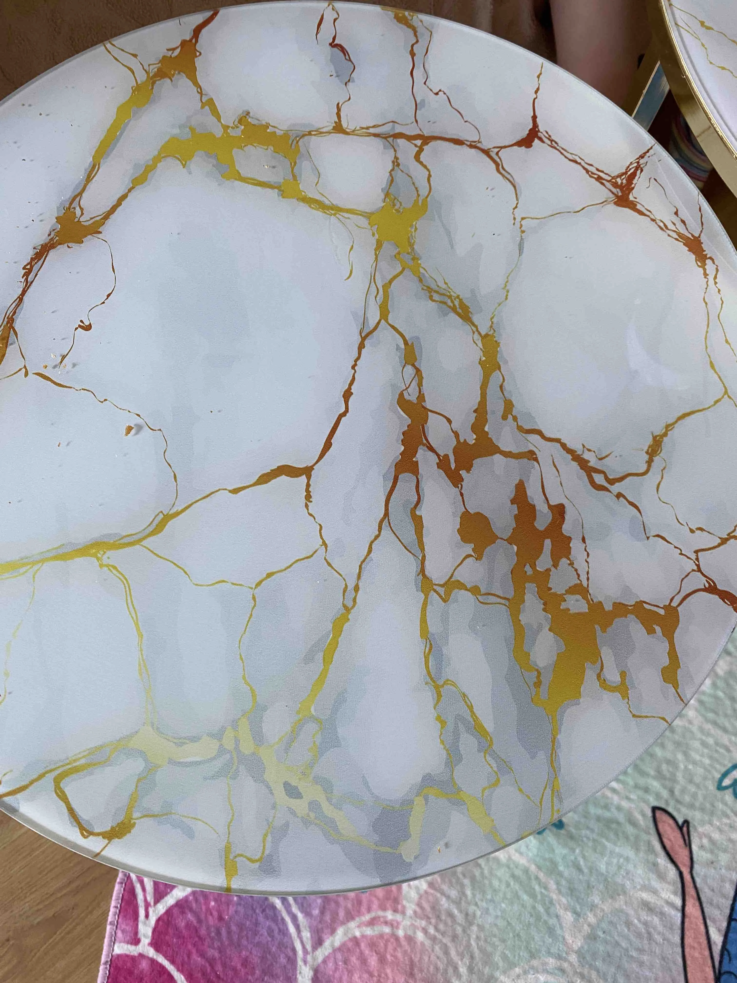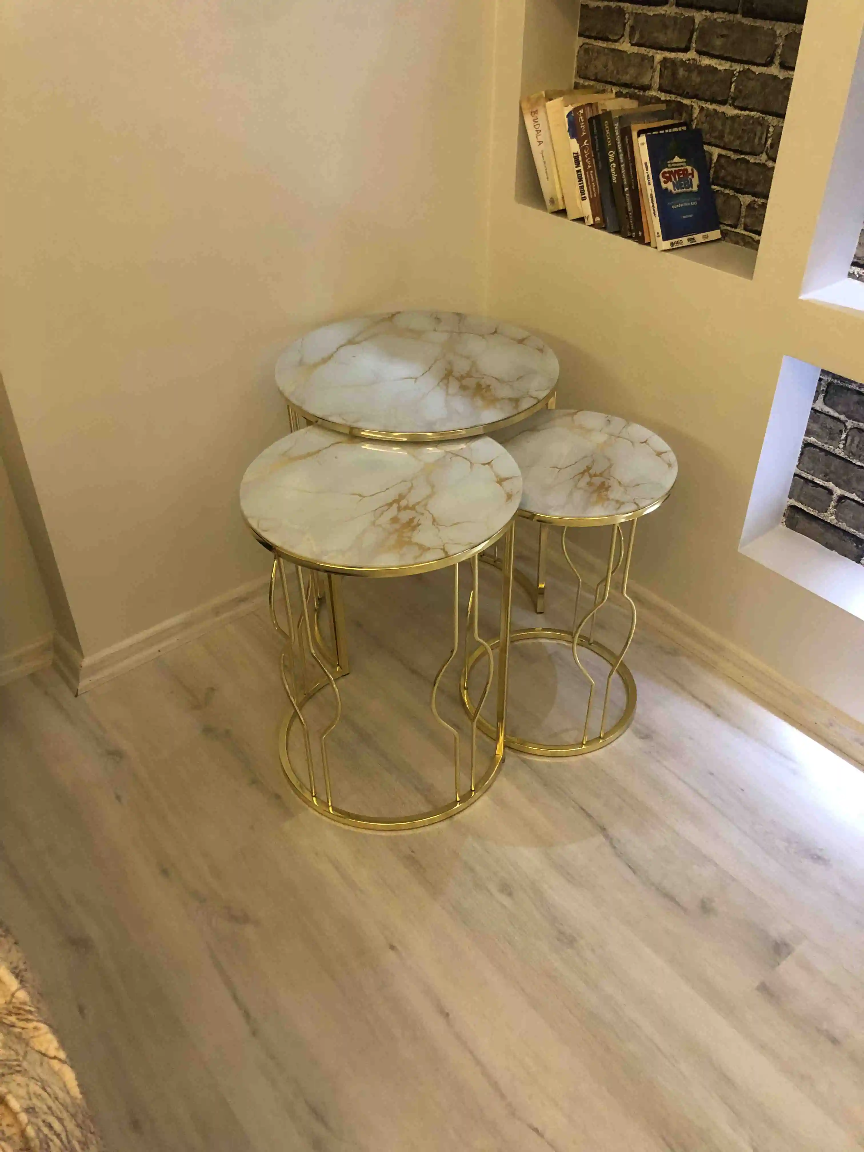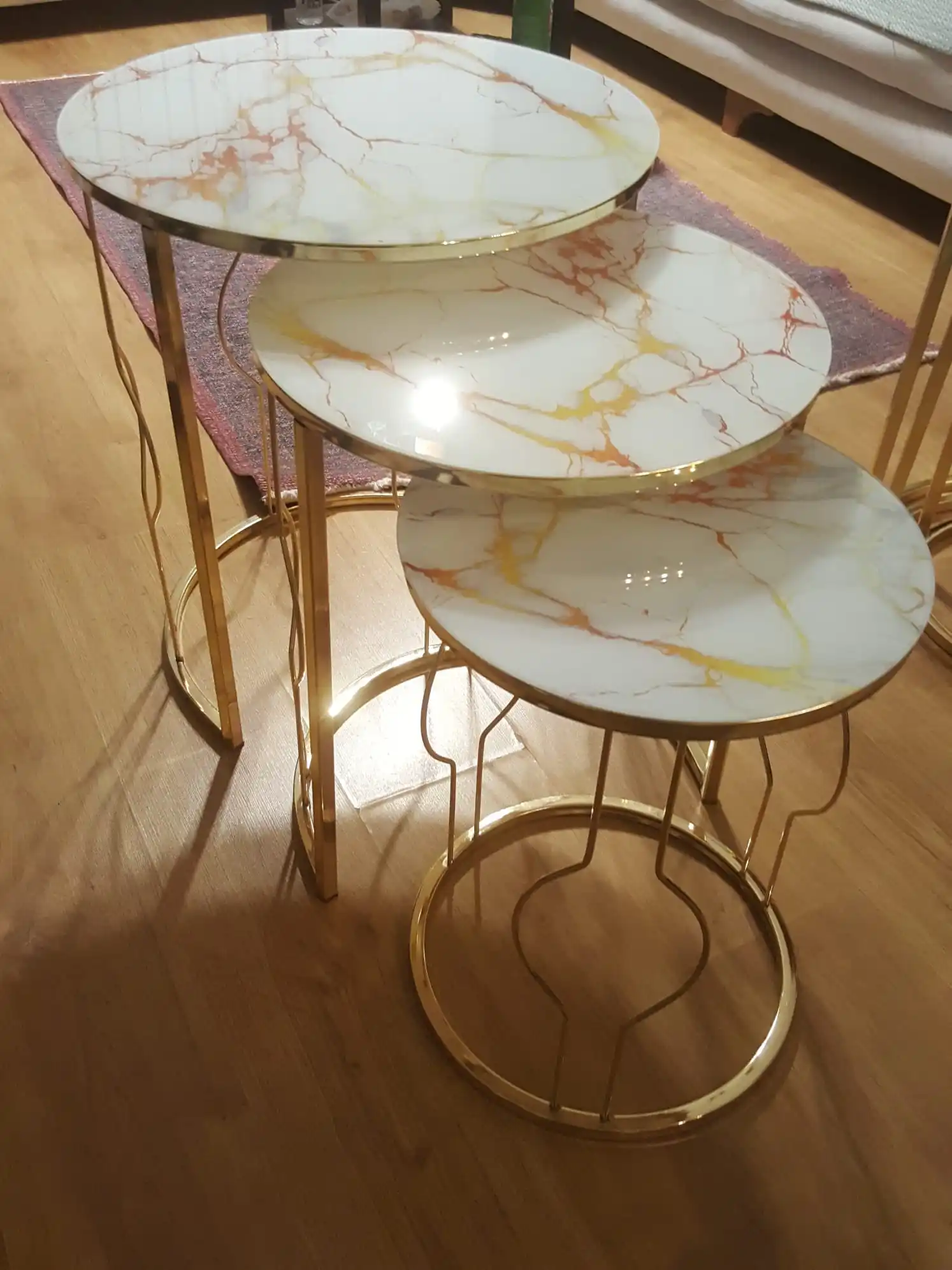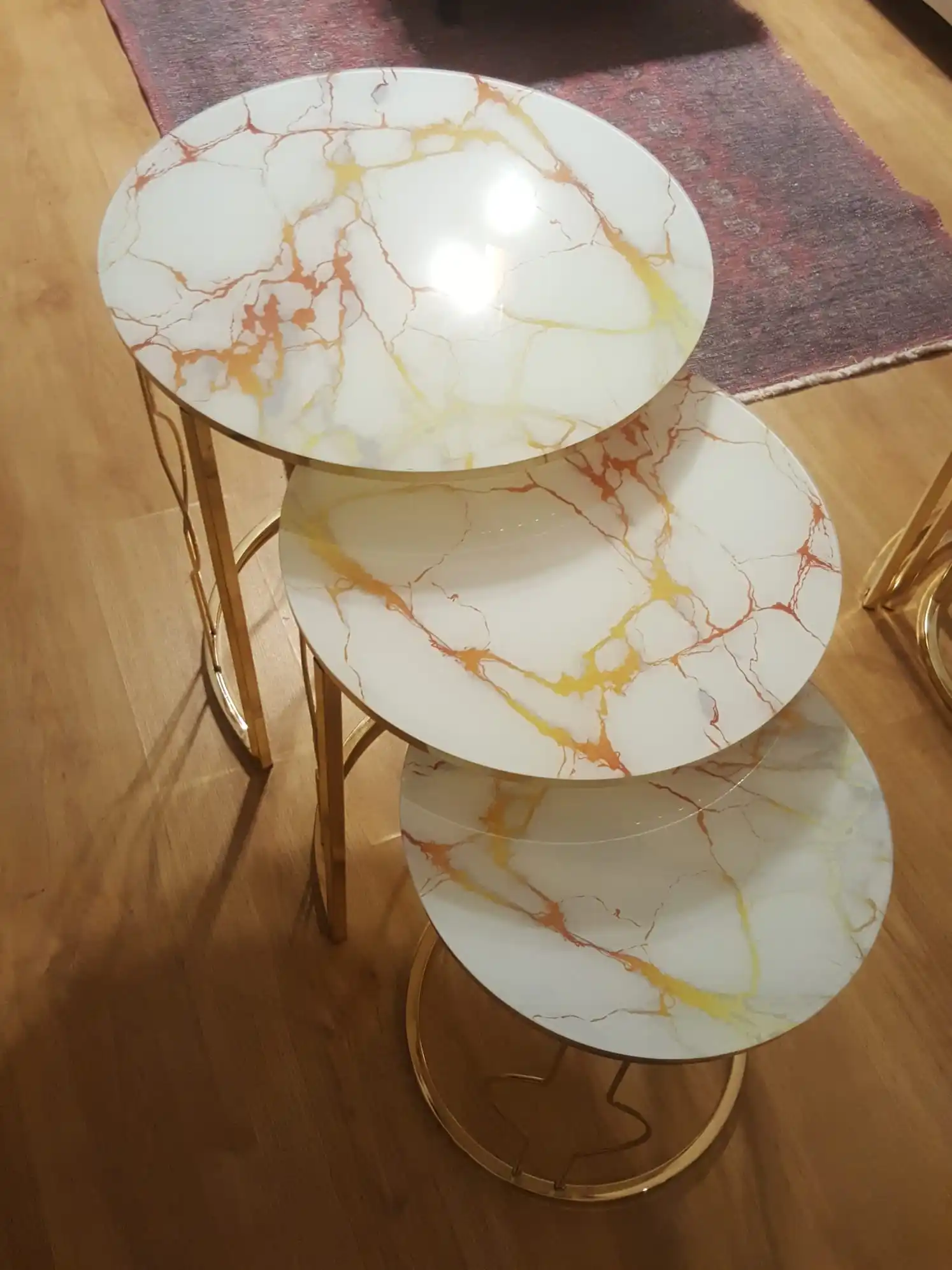 MODEL GOLD METAL NESTING TABLE UNBREAKABLE TEMPERED GLASS VEIN MARBLE