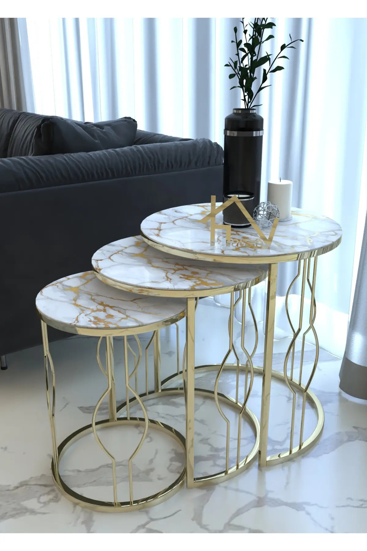 MODEL GOLD METAL NESTING TABLE UNBREAKABLE TEMPERED GLASS VEIN MARBLE