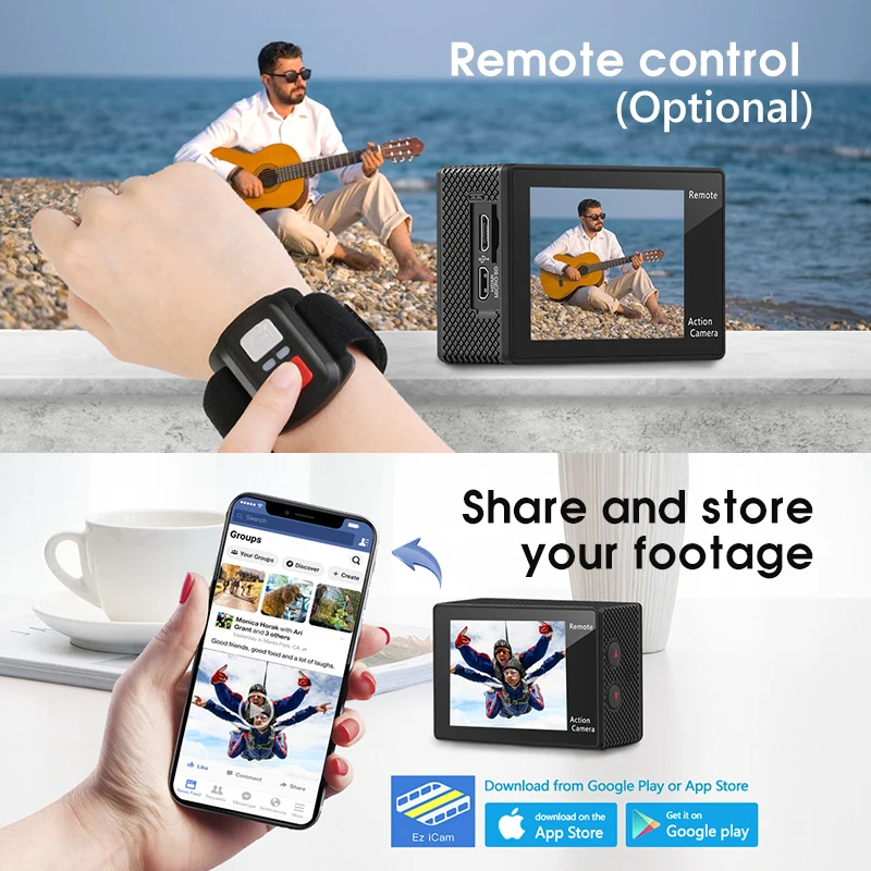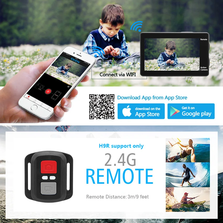 EKEN H9/H9R can take photos and video by using 2.4G wireless remote control function. It is an optional accessory. If you need one, please choose H9R. The Remote control is not waterproofed. DO NOT use the remote control under the water