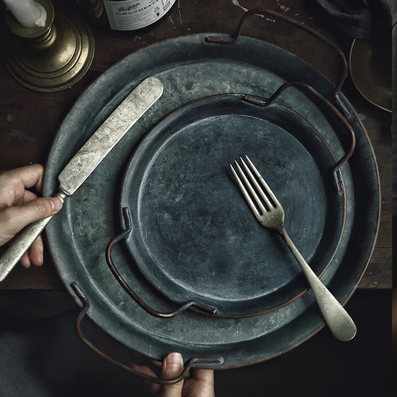 Retro Metal Plate With Handle Handcrafted Round Wrought Vintage Storage Bread Tray Home Decoration Garden Restaurant quantity