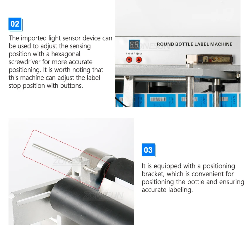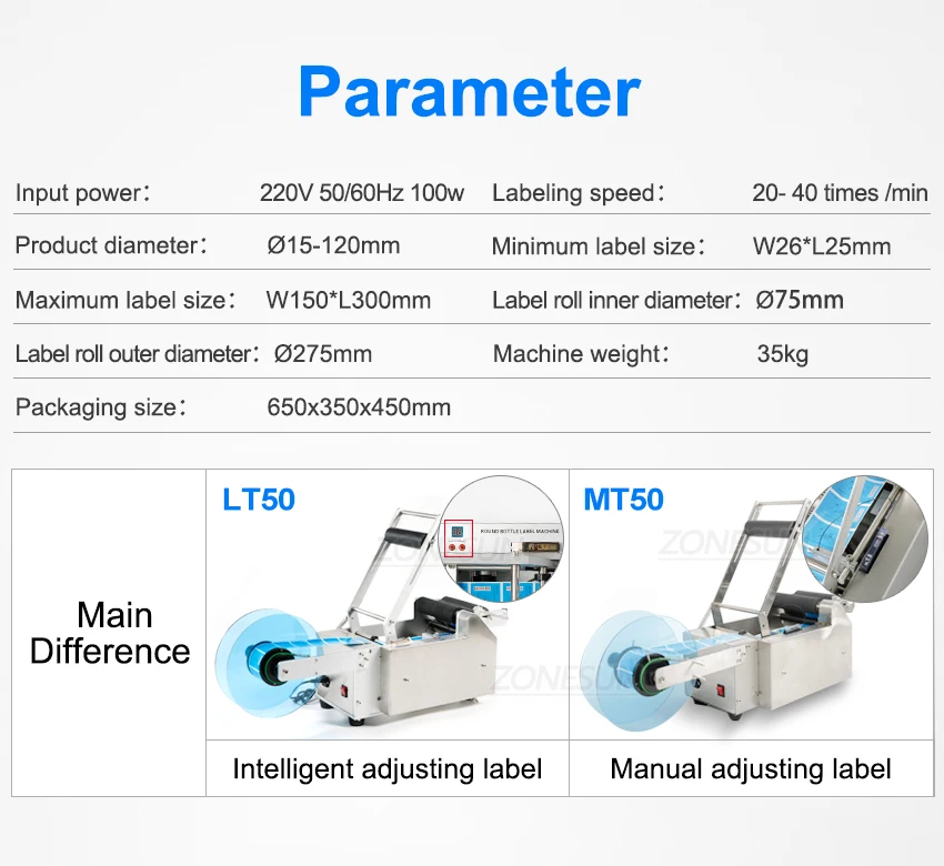 1.These two machine are designed for labeling on round bottle surface,LT-50 can not be used with transparent label,but LT-50T can be used with it,please choose the right machine.