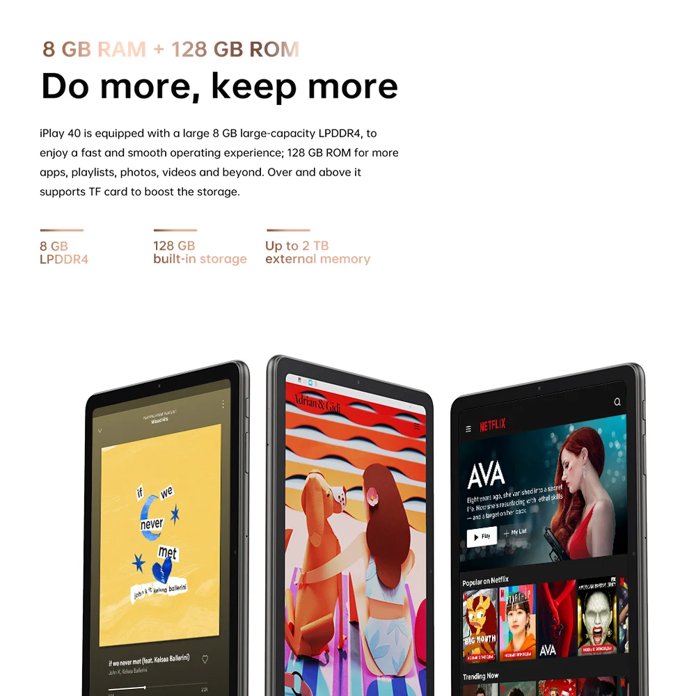 iPlay 40 is equipped with a large 8 GB large-capacity LPDDR4, to enjoy a fast and smooth operating experience; 128 GB ROM for more apps, playlists, photos, videos, and beyond. Over and above it supports TF card to boost the storage.