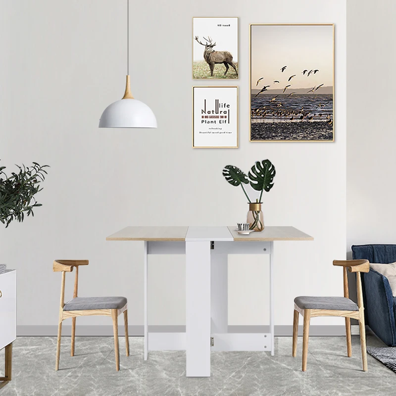5. Product description: foldable dining table with console. Concrete and white decor. Adapt to space and needs. Provide 2 rotating feet.