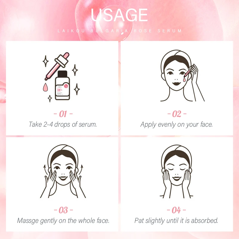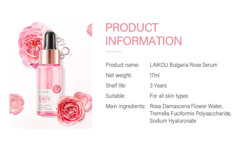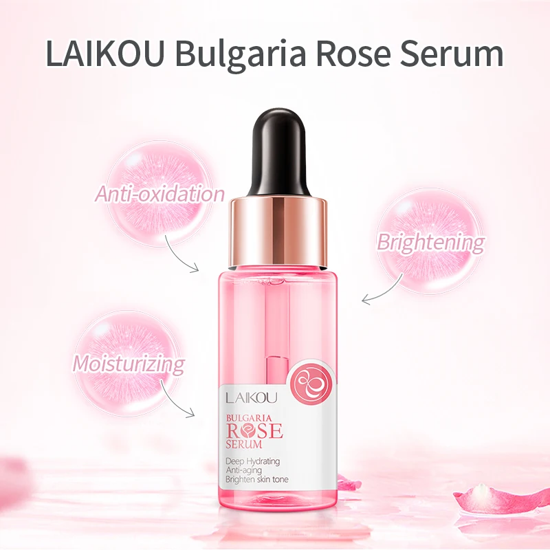 Containing Rosa Damascena Flower Water and other moist-keeping factors, LAIKOU Bulgaria Rose Serum can replenish sufficient moisture and nutritions to skin quickly. It can resist oxidation, reduce skin aging problems, making your skin moisturized, bright and soft.