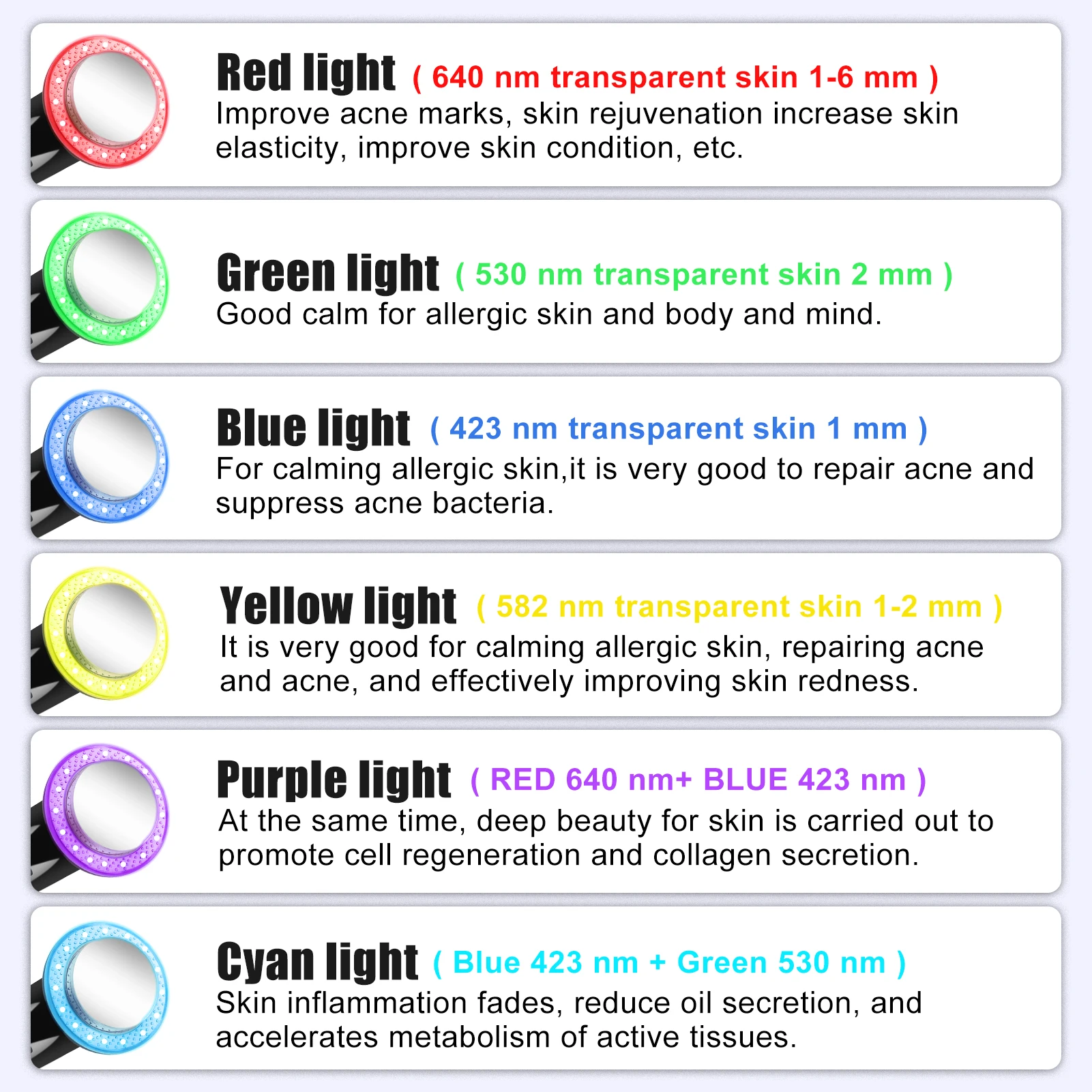 4.Green light(490nm):penetrating skin 1mm.Enhance cell energy, promote metabolism and improve skin quality