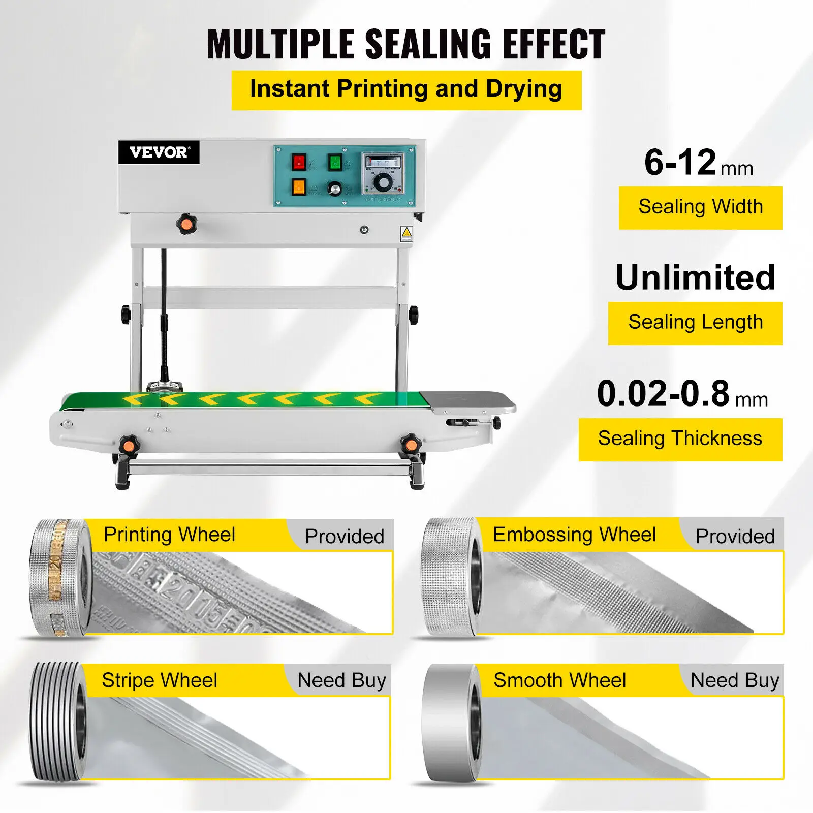 The sealing machine is equipped with a thickened conveyor belt, durable, and anti-friction. Sealing Width: 6-15 mm; Sealing Length: Unlimited. Film Sealing Speed: 0-12m/min.